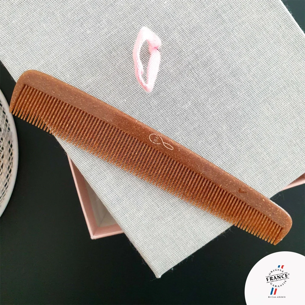 Matière : bioplastique végétal, à base de miscanthus, afin de ne pas se dégrader pas dans le temps d’être utilisé directement sur cheveux mouillés.